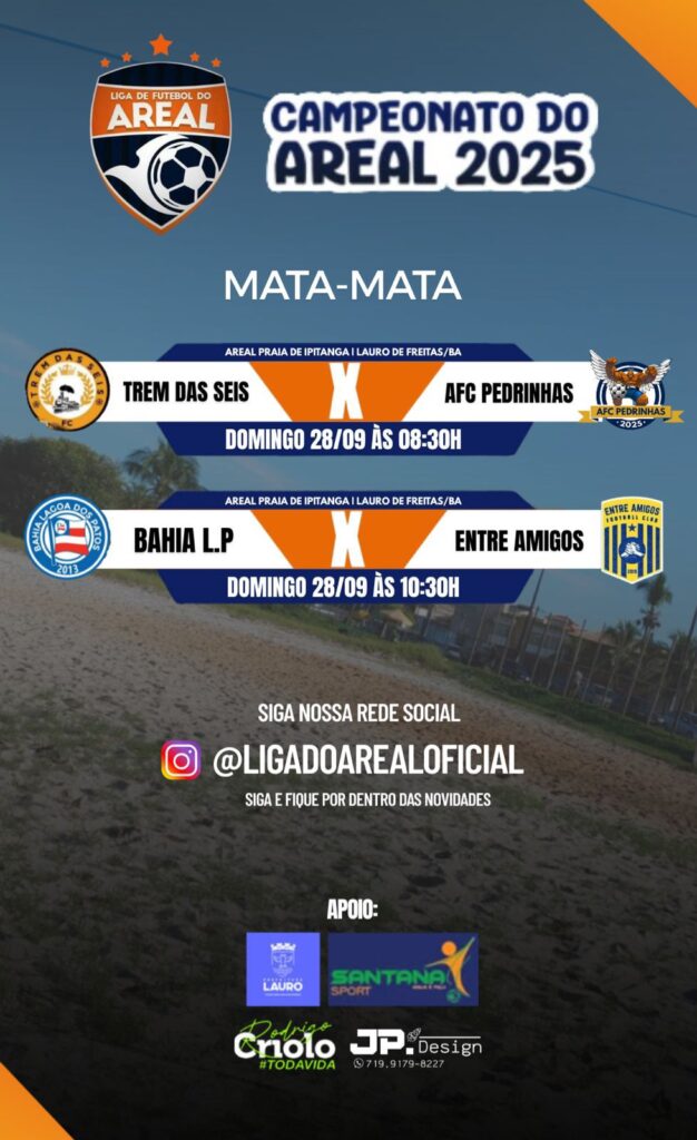 Já no domingo (28/9), a programação de futebol começa cedo, às 8h, com a Copa Verão de Futebol de Base, também no Estádio de Itinga. Em seguida, a partir das 8h30, a bola rola na praia de Ipitanga para os jogos do Campeonato do Areal, com os confrontos Trem das Seis x AFC Pedrinhas e Bahia L.P x Entre Amigos.